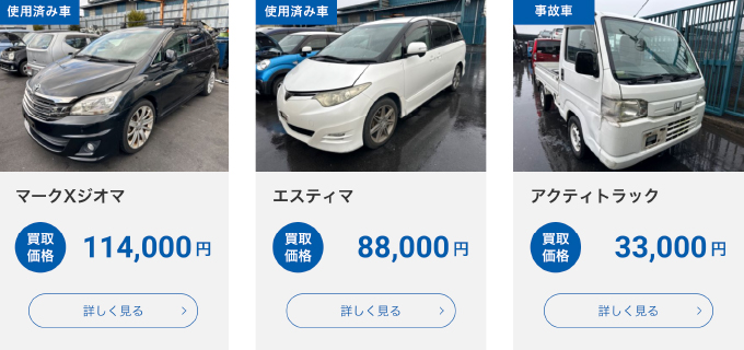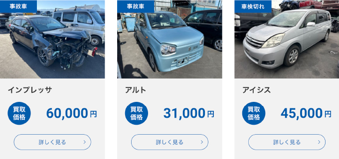 事故車・故障車・低年式車・車検切れ車など、どんな車も査定から引き取り費用まで無料で買取る安心の実績。