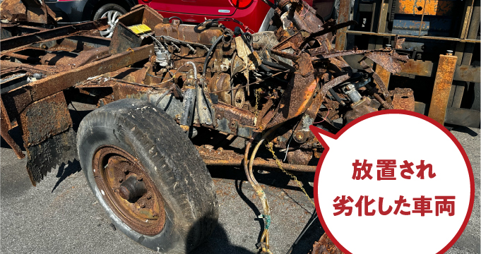 エンジンがかからない、車検が切れている、長く置いてあり、腐食してボロボロ・・・。